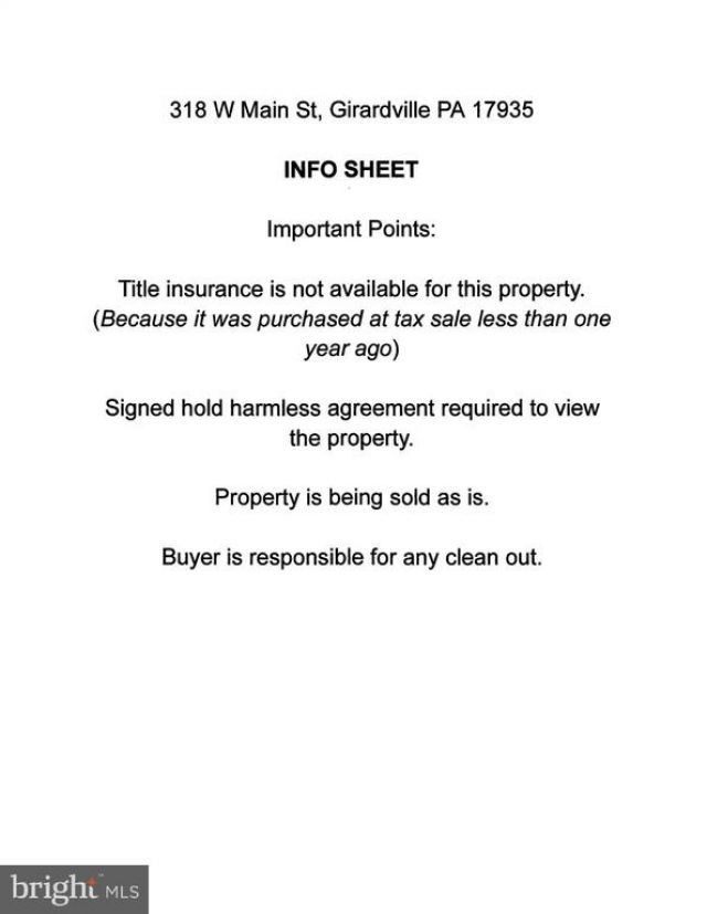 Rehab Home in Girardville, PA. Sold as-is. Buyer responsible for any clean out. Cash sales only. Title insurance is not available for this property due to it being purchased at tax sale less than one year ago. Call today for any questions!